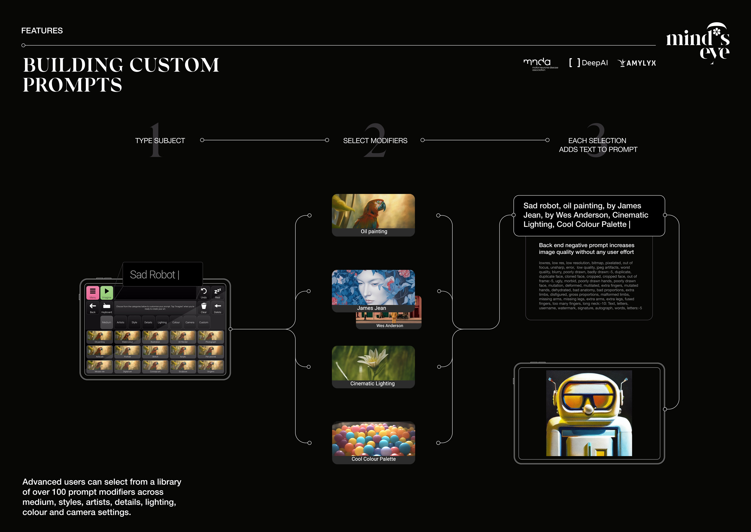 Accessibility and inclusivity for AI is not where it should be yet. As a result, many groups are excluded from expressing themselves through art. Mind's Eye enables people with MND/ALS to create AI-generated art in the style they choose. It can be ‘one-click create’, or with more than 100 different options—art that can be admired, saved and shared.